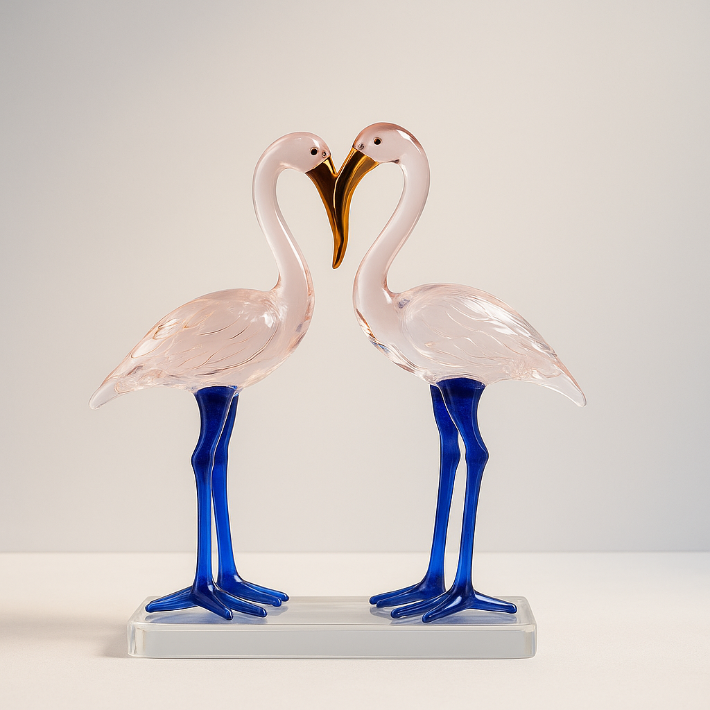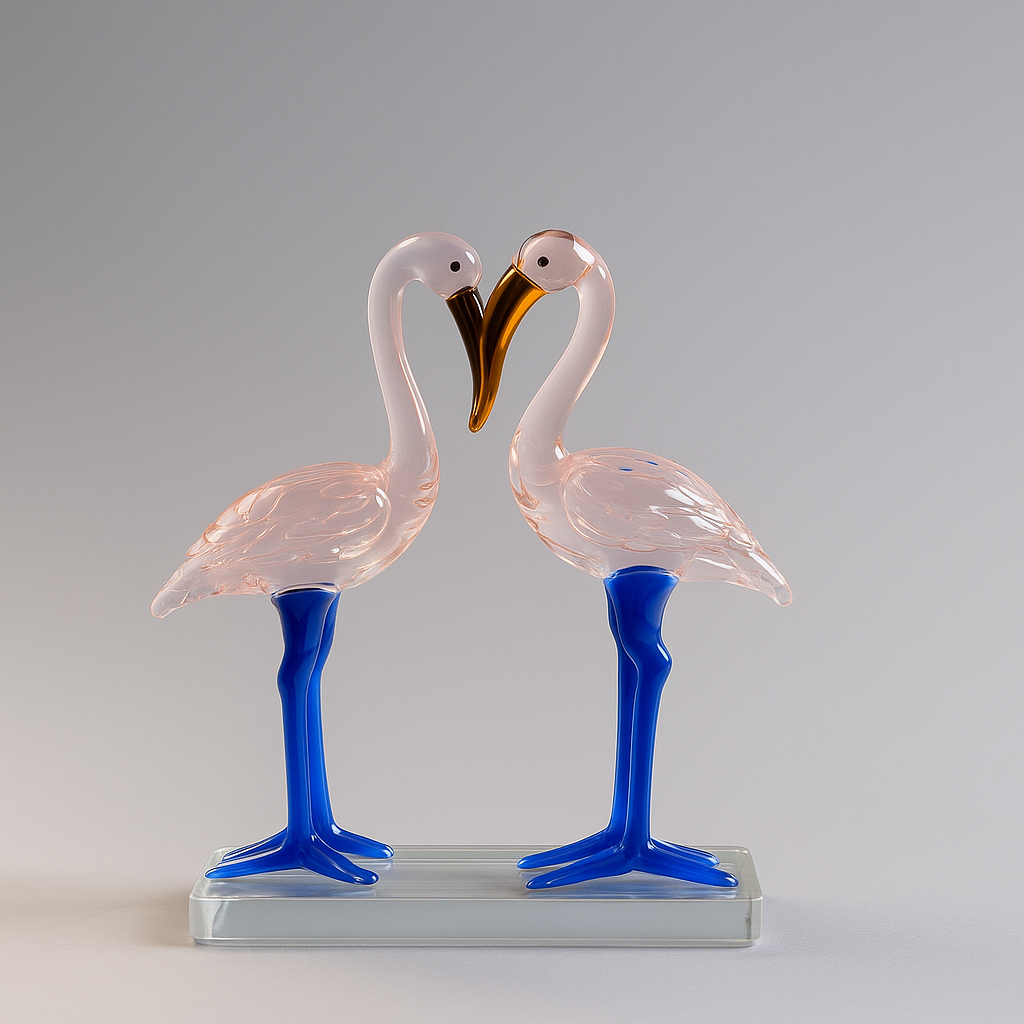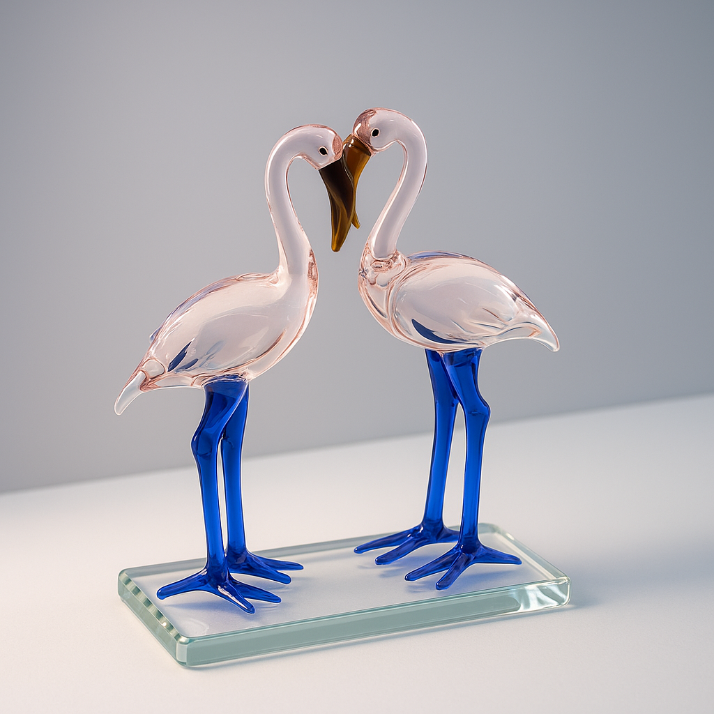 Celebrate the beauty of love and togetherness with Blush Bond, a handcrafted glass sculpture of two flamingos poised beak-to-beak in tender harmony. With soft blush-pink bodies, deep cobalt blue legs, and golden-tipped beaks, this figurine captures affection and balance in the most graceful form.