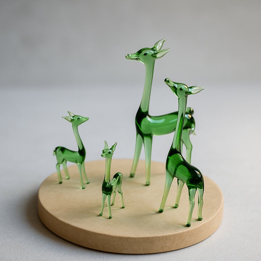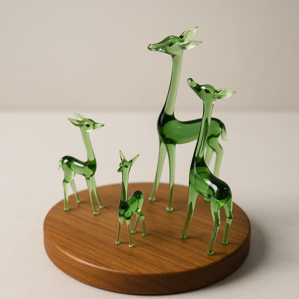 Step into the heart of nature with Emerald Canopy, a beautifully handcrafted set of glass giraffes sculpted in vivid green. Featuring two tall adults and two playful calves, this family stands proud on a polished wooden base, symbolizing growth, grace, and the bond of togetherness.