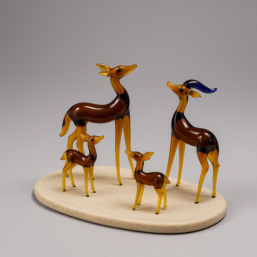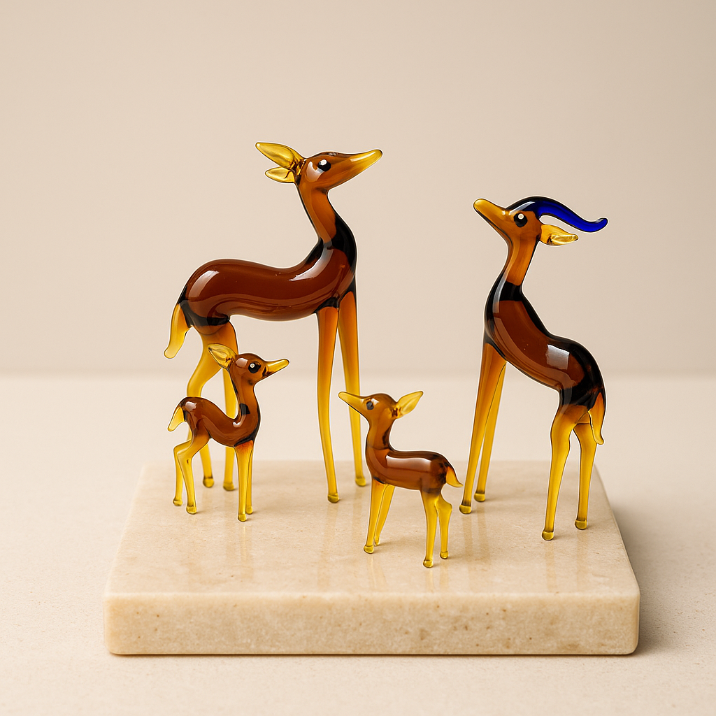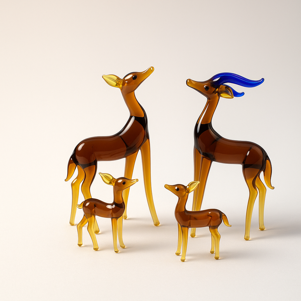 Step into the heart of the wild with Golden Grove, a handcrafted glass sculpture set featuring a graceful deer family in rich amber hues. With fluid forms, upright posture, and a striking stag adorned in deep blue antlers, this set captures the spirit of the forest — calm, protective, and timeless.