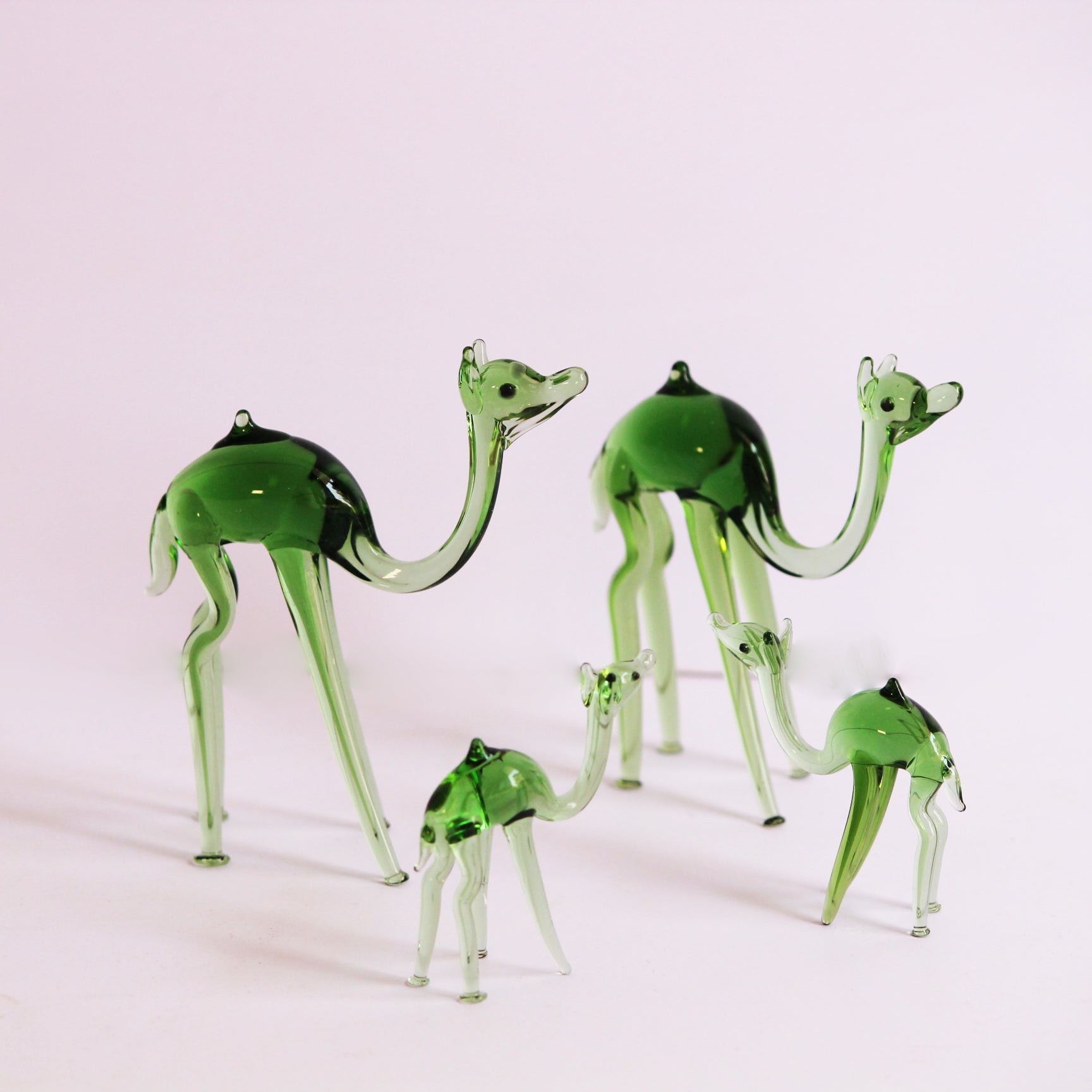 Wander into a world of wonder with Oasis Glow, a graceful set of handcrafted glass camels in refreshing emerald green. Featuring two adults and two calves, each camel is delicately sculpted with elongated legs, arched necks, and soft expressions — embodying calm, endurance, and the nurturing bond of family.