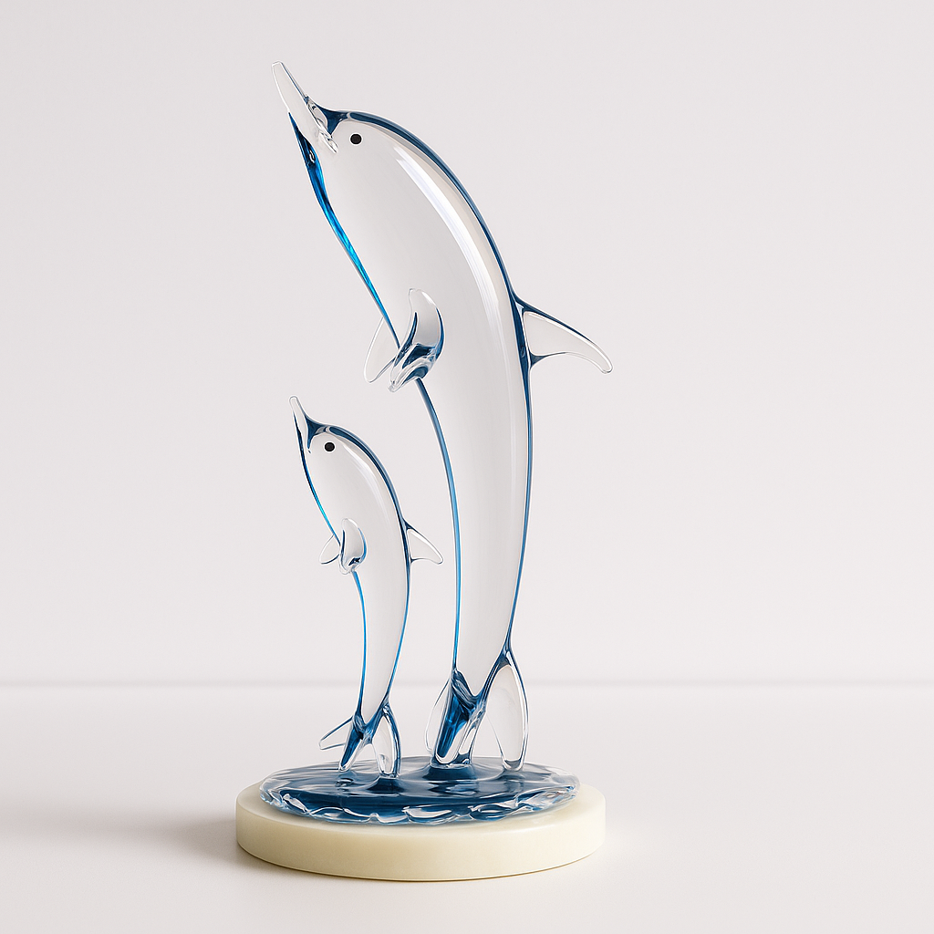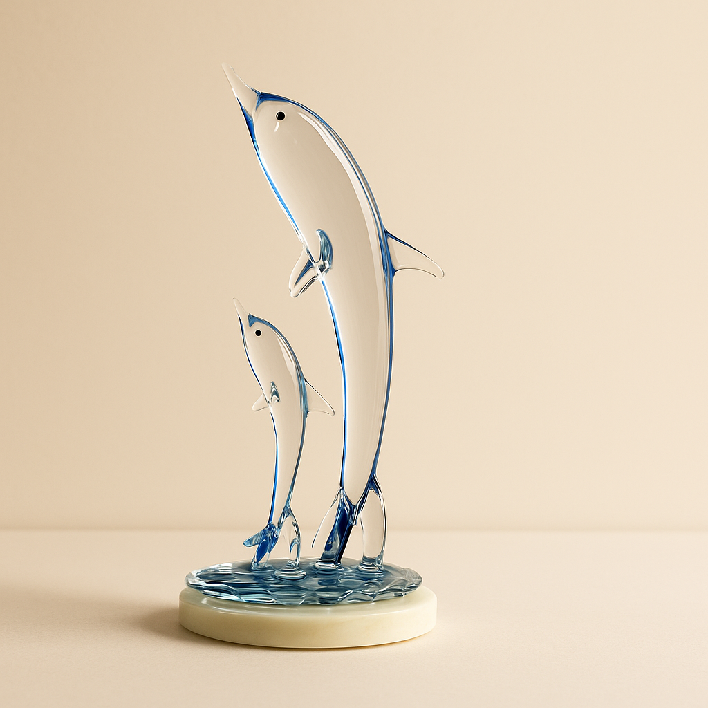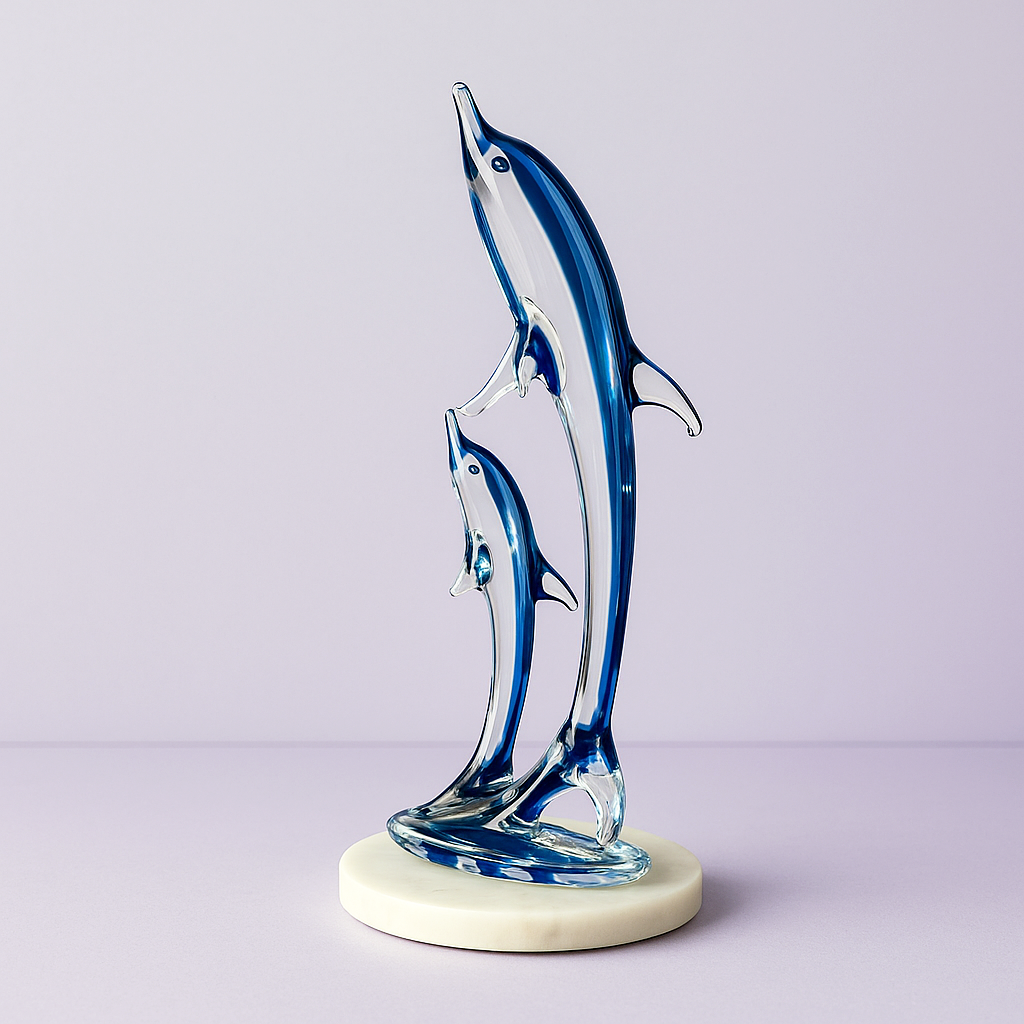 Sculpted in crystal-clear glass with ocean-blue accents, this duo symbolizes harmony, protection, and free spirit. Resting on a smooth circular base, it’s a striking statement piece for any coastal-inspired home, office shelf, or heartfelt gift.