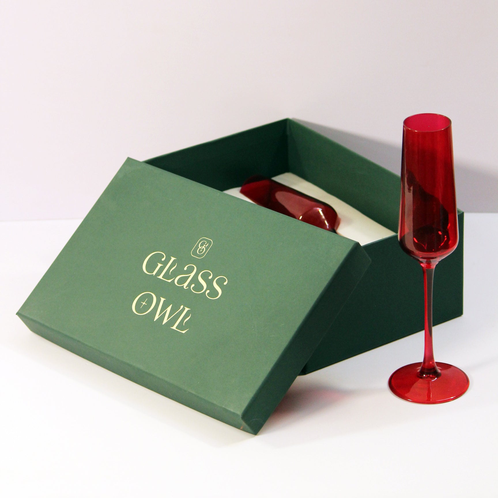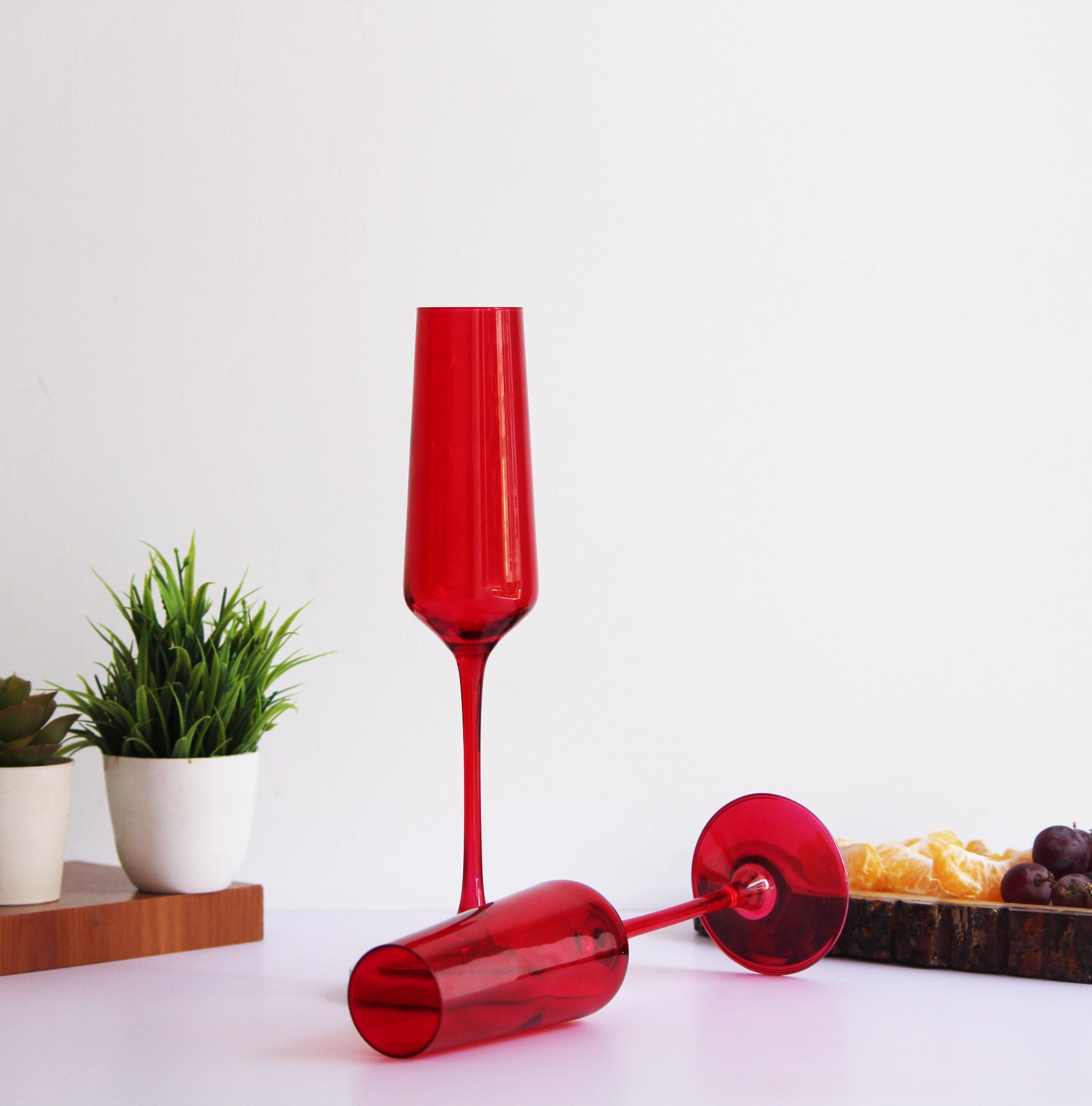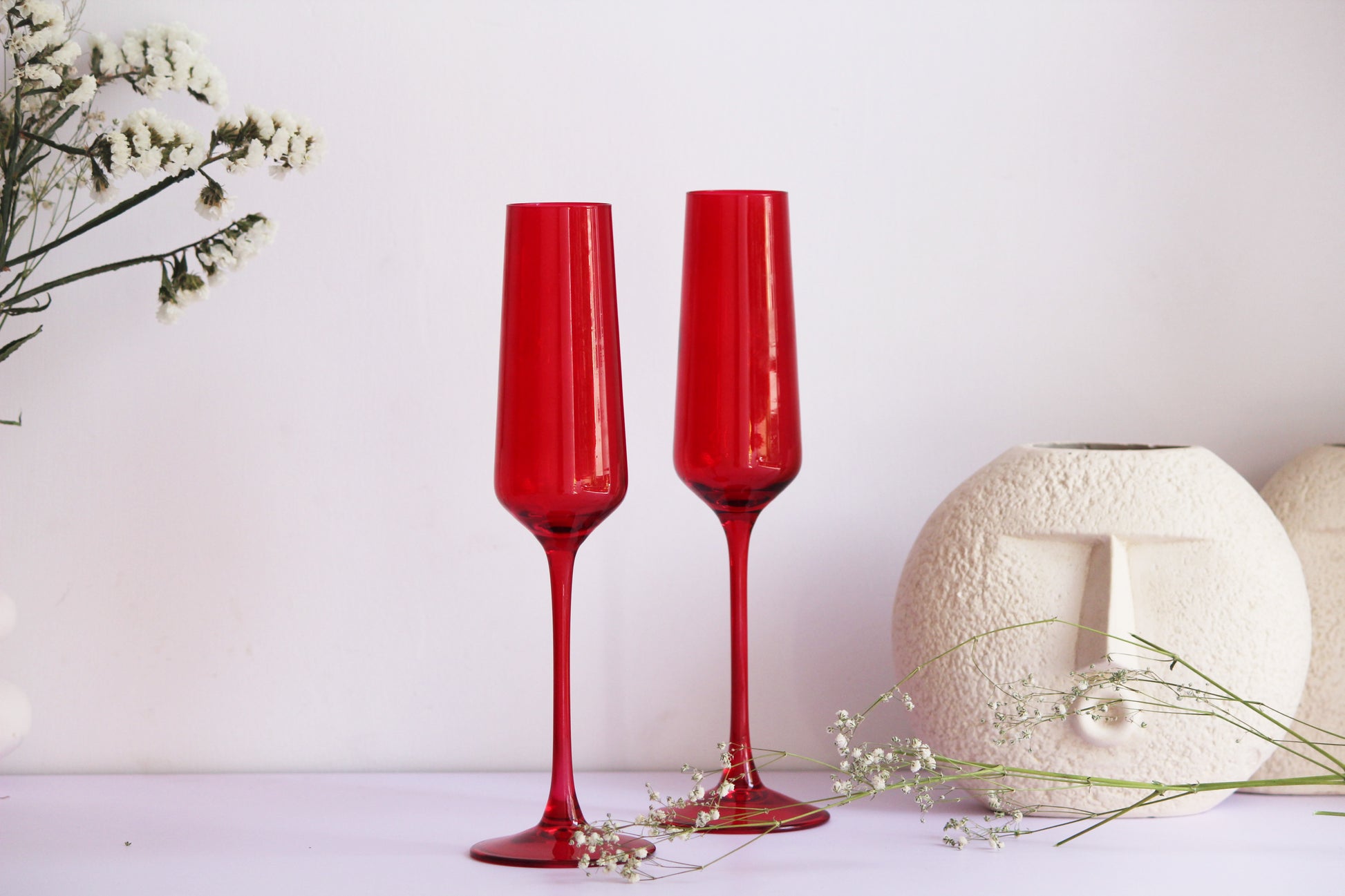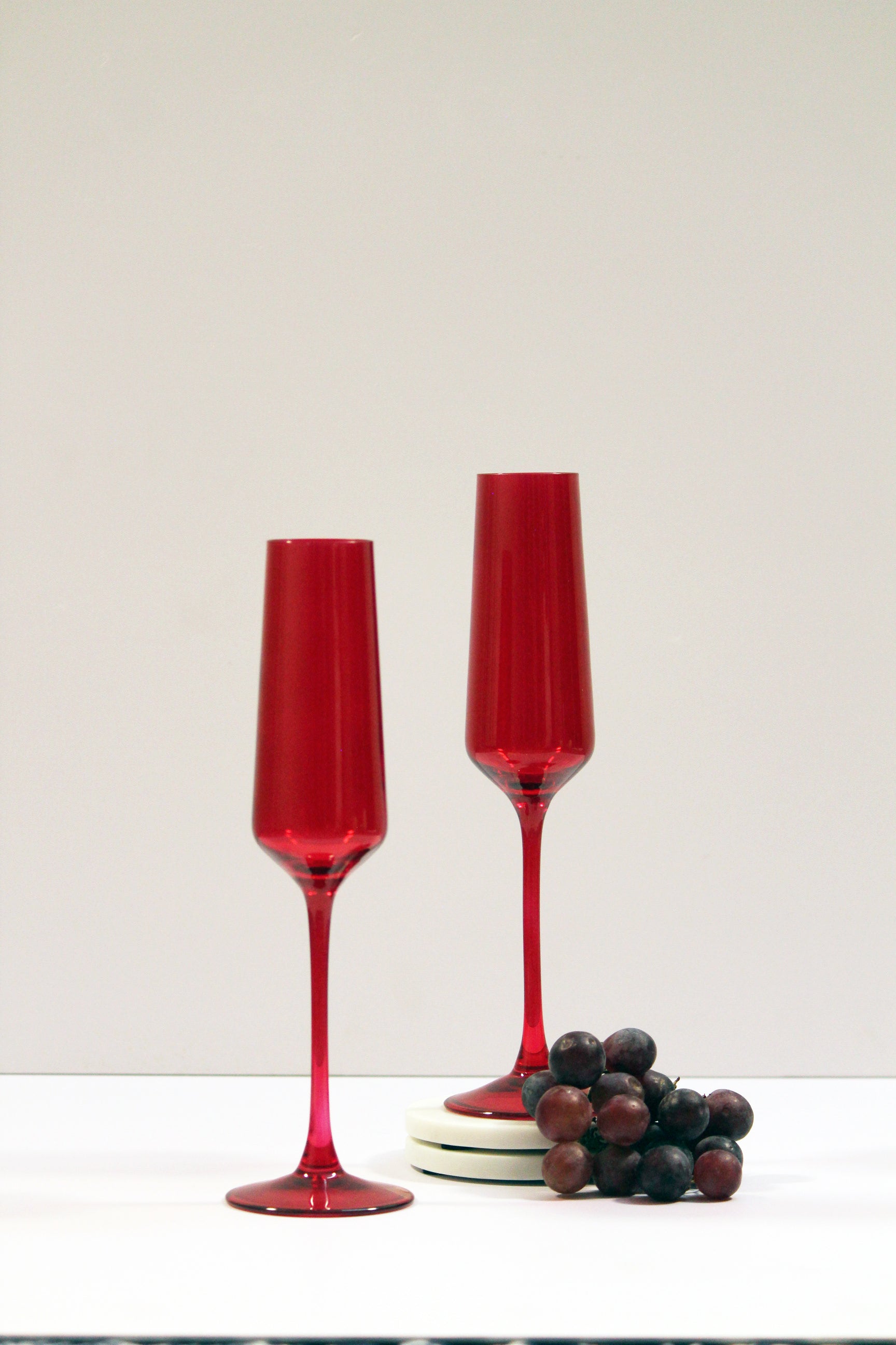 Elegant, bold, and full of allure — our Ruby Red flute glasses are colored to perfection. A stunning choice to add a pop of color and luxury to your celebrations.